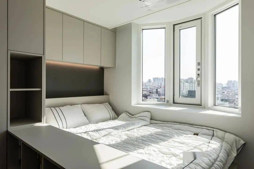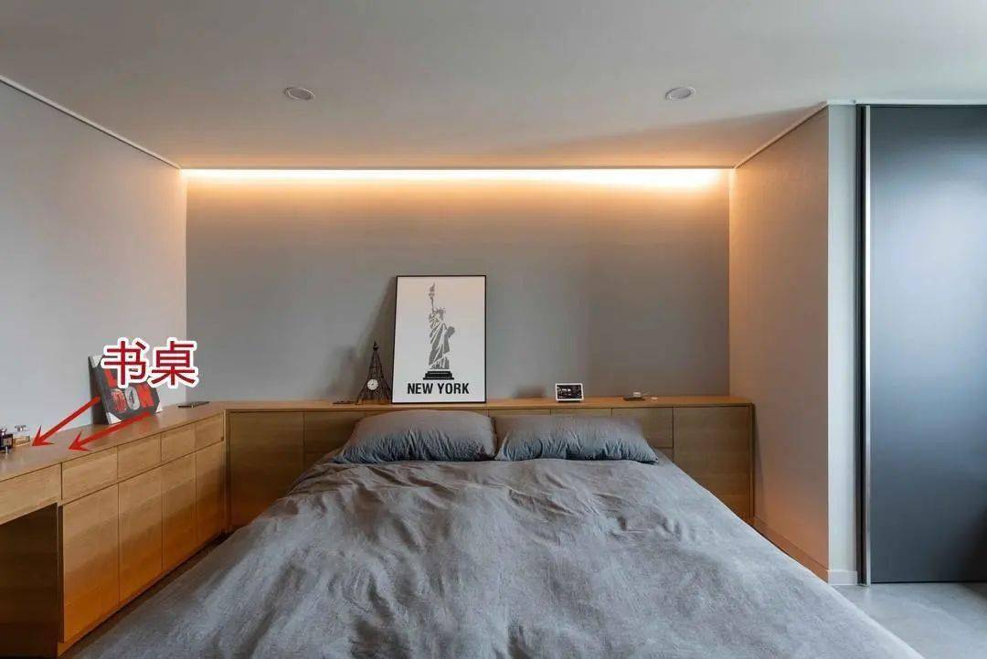 床头面积比较小,也可以考虑在侧面内嵌一个更简单的置物区,用来随手放手机、水杯等物品,顶部加入吊柜,用来收纳书本等杂物也很不错,提高了空间利用率。