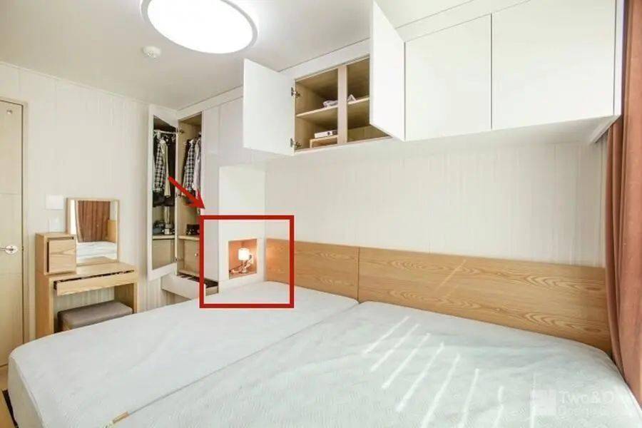不用来收纳衣物也是可以的,床头定制收纳柜,两侧都根据插头位置设计留空置物区,也能很大程度增加收纳空间。