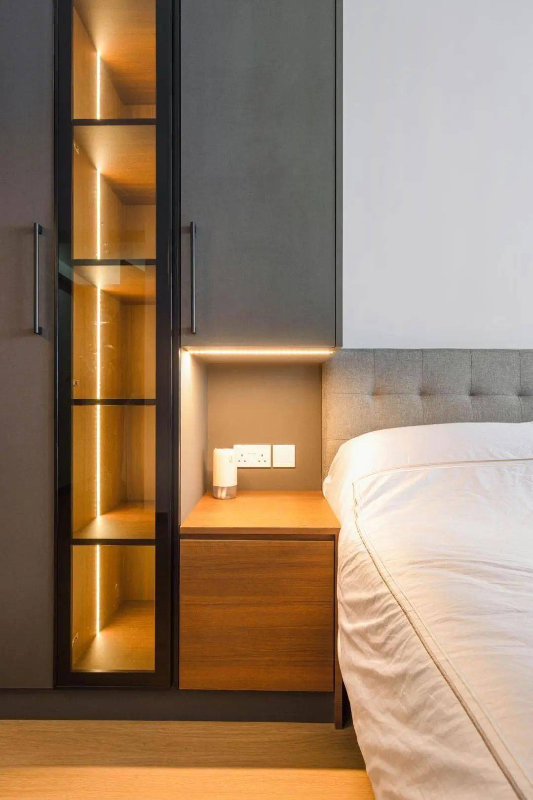 整面衣柜留空设计置物区,半护墙+置物区的一体化设计把床头柜省了,让空间的整体感更好,让卧室更显得干净、利落。
