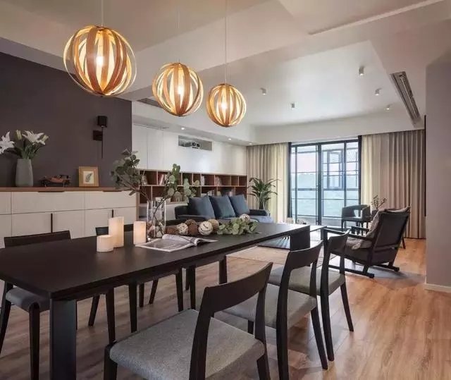 在客厅的延伸空间设置了一个开放式的餐厅,木质的餐桌餐椅搭配独特创意的吊灯,将用餐区的柔和温馨尽显出来。