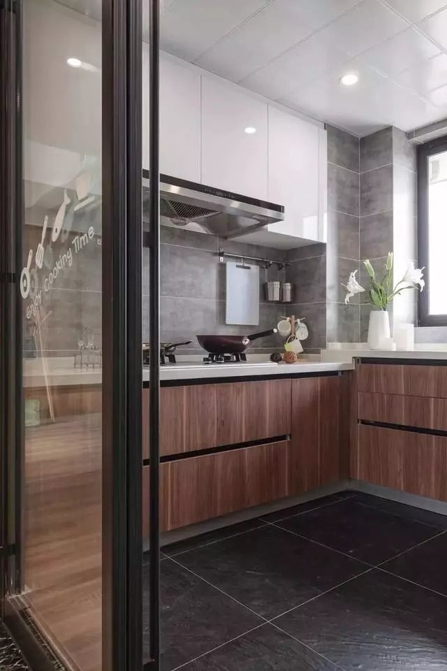 仿古的黑色地砖、水泥灰墙砖,木质的一体式橱柜,将厨房打造成开阔大气的简约空间。