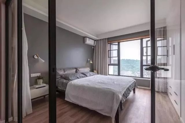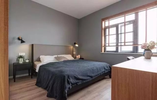 次卧采用木质的地板搭配灰色的背景墙,在灯光下,迷离而又带着幻想的柔和色彩。