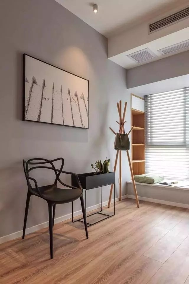 开阔的过道旁摆着木质衣帽架,用来挂置包包等物品,推开旁边的门便可一睹卧室的风采。