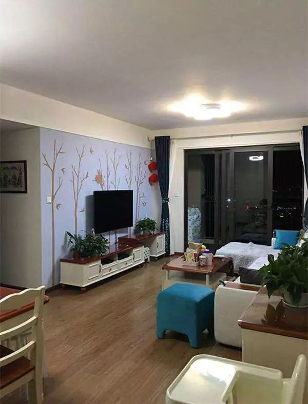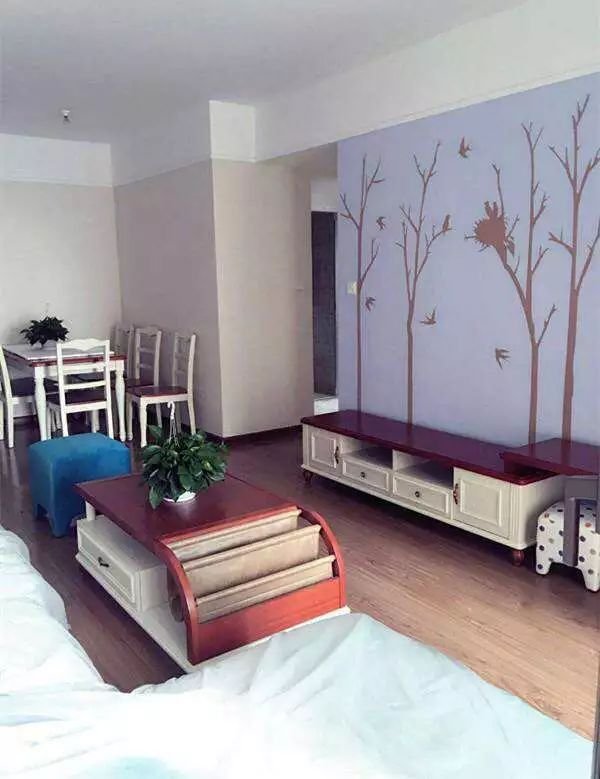 电视墙的背景用了墙绘,蓝紫色调搭配树干干枝,很有现代的时尚感。电视机是挂墙式的,给电视柜腾出更多的空间,而且也不占用空间,再用植物去装饰,营造出自然的气息。电视柜、茶几、餐桌是一同购买的,台面的木色很优雅。窗帘墨绿色和白色两层,遮光效光很好。客厅和阳台相通,采光充足。
