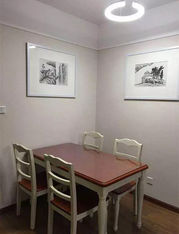 进门最先到的就是餐厅,一张长方形的餐桌,搭配四张餐椅,有客人来时把餐桌移动出来,添加两张餐椅还是可以的。背景墙用暖色的墙漆搭配两幅装饰画,简简单单。