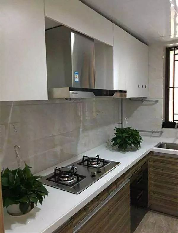 厨房木纹的橱柜门,搭配白色的石英石台,干净整洁。而橱柜门是用了隐形的拉手,使用方便也容易搞卫生。吊柜用了白色与背景墙的瓷砖搭配,形成统一。L形的布局设计按照了洗切炒顺序,设计合理。
