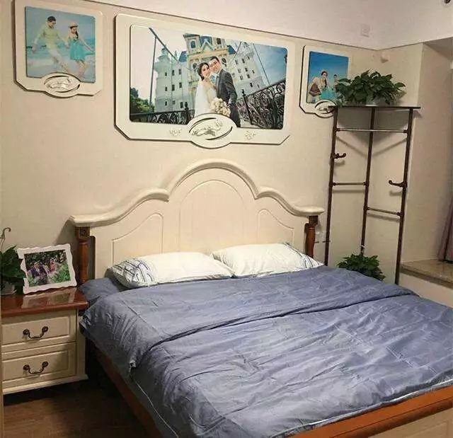 主卧是我们的房间,一张舒服的实木大床,搭配深灰色的床品,给人的身心得到放松的感觉,床头背景墙用了我们的婚纱照,简单又漂亮,转角处用了一个铁架,放上盆栽,呈现出自然的气息。