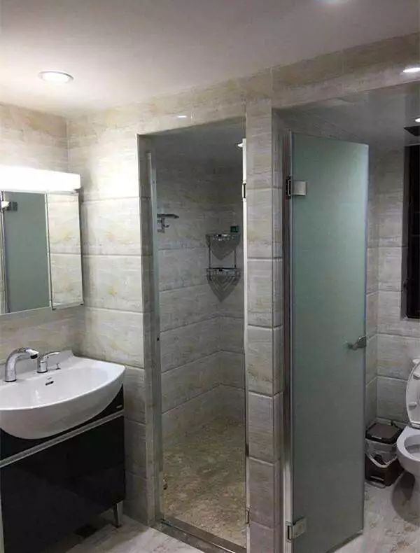 进人卫生间后再分了两个门,也就是一门双卫的效果。黑白搭配的洗手台放在外面,起到干湿分区,墙面都贴满了灰色的瓷砖,两个卫分别是淋浴房和放马桶的,再次起到干湿分区,使用起来很方便。